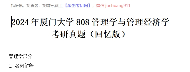 以上是聚创厦大考研网为考生整理的"2024年厦门大学808管理学与管理经济学考研真题(回忆版)"的相关考研信息,希望对大家考研备考有所帮助! 备考过程中如有疑问,也可以添加老师微信juchuang911进行咨询。