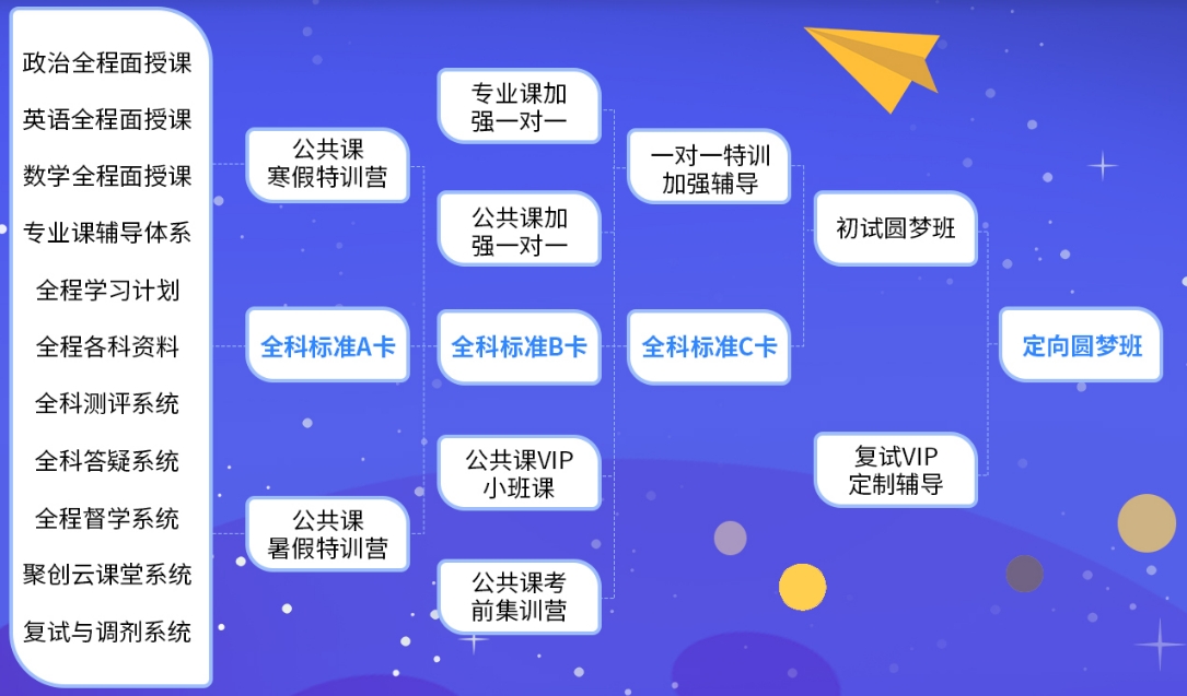 聚创二战集训营,安排高级考研规划师线上+线下不限次数院校专业选择服务,并且根据自身情况及目标院校分析,从专业内涵认知、意向专业选择、意向学校选择、学习成绩匹配、再到院校专业确定,为合理选择力所能及的院校和专业。