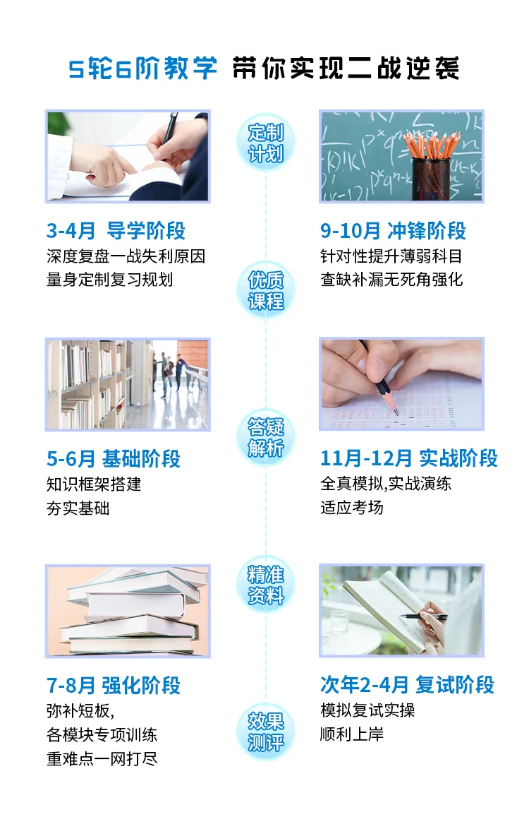 厦门聚创考研二战集训营提供了详细的学习规划,包括入营测试、定期实战模拟、优质师资坐班答疑等环节,以确保学生能够及时了解自己的学习状况,并根据反馈进行针对性的提升。