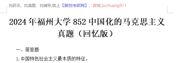 以上是聚创考研网为考生整理的"2024年福州大学852中国化的马克思主义真题(回忆版)"的相关考研信息,希望对大家考研备考有所帮助! 备考过程中如有疑问,也可以添加老师微信juchuang911进行咨询。