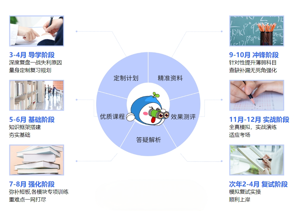 初试到复试,分阶靶全方位提升;分导学、基础、冲刺、强化、实战、复试6个阶段辅导!