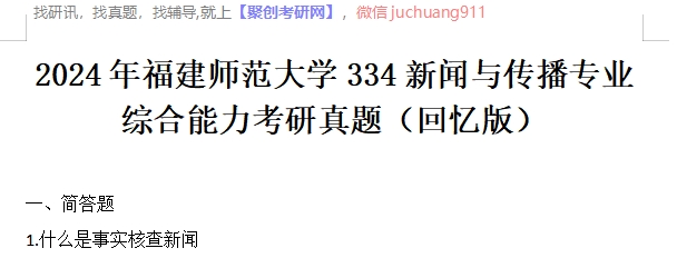 以上是聚创考研网为考生整理的"2024年福建师范大学334新闻与传播专业综合能力考研真题(回忆版)"的相关考研信息,希望对大家考研备考有所帮助! 备考过程中如有疑问,也可以添加老师微信juchuang911进行咨询。