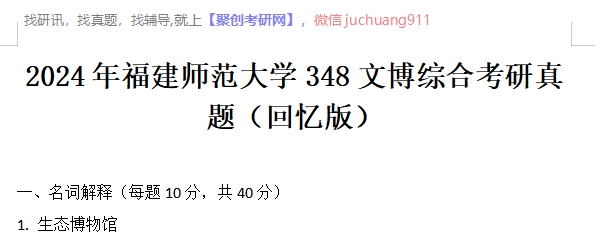 以上是聚创考研网为考生整理的"2024年福建师范大学348文博综合考研真题(回忆版)"的相关考研信息,希望对大家考研备考有所帮助! 备考过程中如有疑问,也可以添加老师微信juchuang911进行咨询。