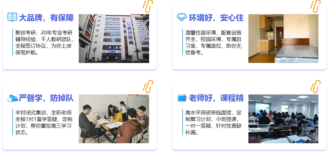 以上是聚创考研网为考生整理的"厦门二战集训考研知识点,厦门二战集训营考研辅导班"的相关考研信息,希望对大家考研备考有所帮助! 备考过程中如有疑问,也可以添加老师微信juchuang911进行咨询。