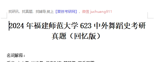 以上是聚创考研网为考生整理的"2024年福建师范大学623中外舞蹈史考研真题(回忆版)"的相关考研信息,希望对大家考研备考有所帮助! 备考过程中如有疑问,也可以添加老师微信juchuang911进行咨询。