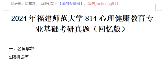 以上是聚创考研网为考生整理的"2024年福建师范大学814心理健康教育专业基础考研真题(回忆版)"的相关考研信息,希望对大家考研备考有所帮助! 备考过程中如有疑问,也可以添加老师微信juchuang911进行咨询。