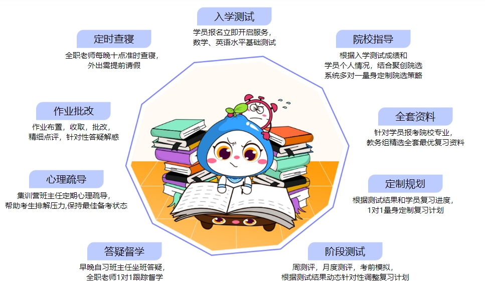 福州聚创考研英语集训营提供的教学服务包括但不限于班主任督学、每月测评考试、院校选择指导、专属复习计划、及时答疑等。这些服务全方位提高了学生的学习效率,确保了学习的质量和效果。
