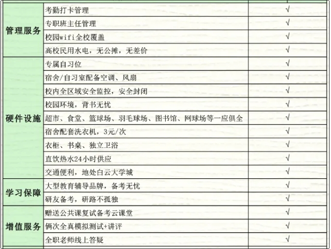 管理服务完善:聚创考研深耕考研行业近20年,为寄宿班学员提供专属管理服务,包括考勤打卡、专职班主任管理、赠送公共课复试备考云课堂、全真模拟测评+讲评、全职老师线上答疑等。