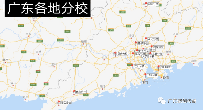 目前广东聚创考研在广东多个地方设置了分校,包括广州、深圳、东莞、珠海、佛山、湛江、韶关、肇庆、茂名、江门等。