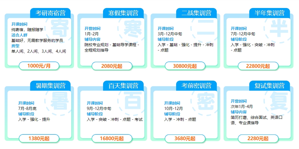 聚创考研集训营提供从基础知识梳理到系统化的辅导策略的一站式教学服务,涵盖全年/半年集训营、寒假集训营、考研冲刺班、1对1二战集训营以及复试调剂等多种课程类型。