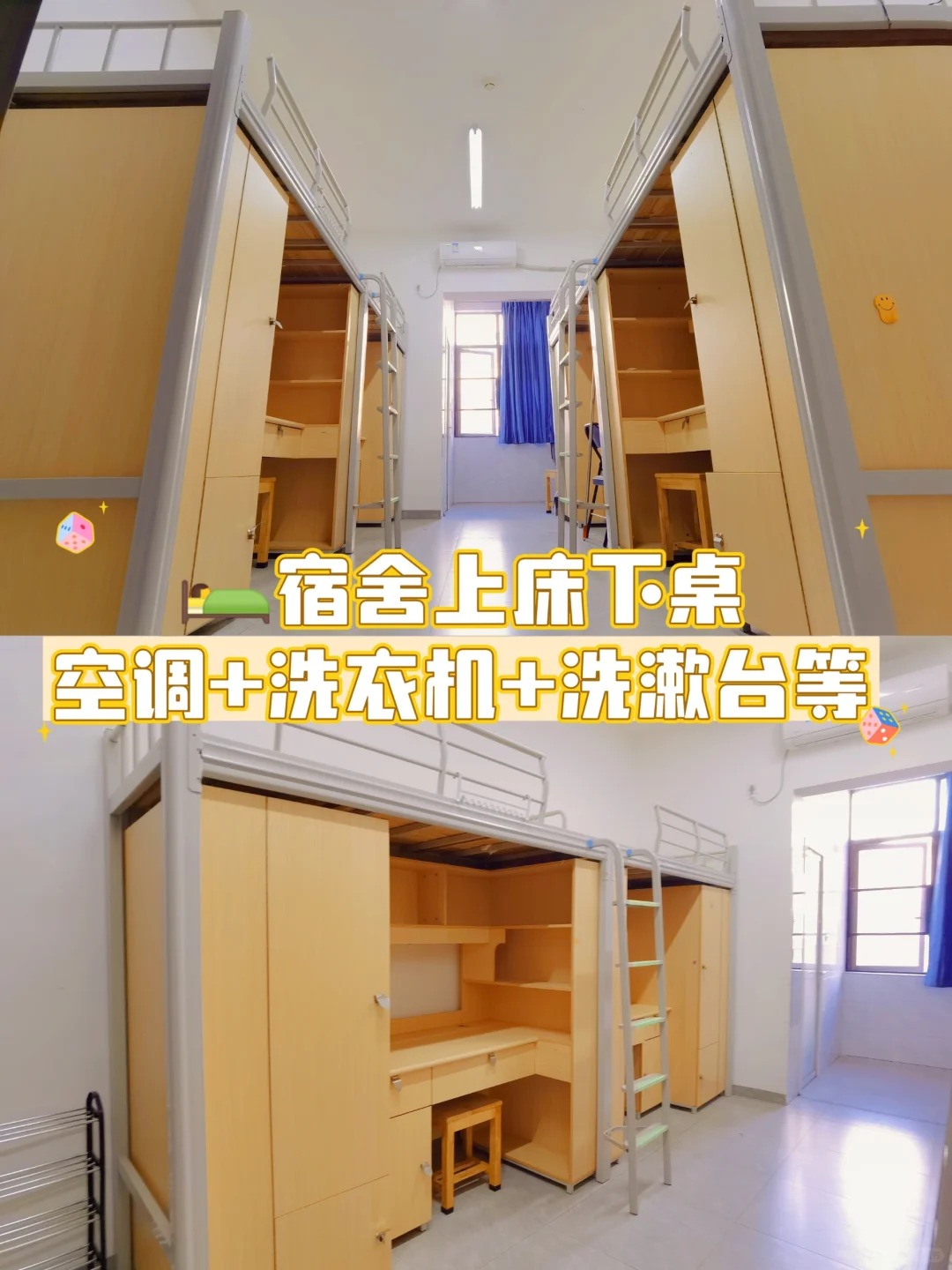 标准学生宿舍,上床下桌,空调、洗衣机、热水器、书桌、衣柜,配备齐全;