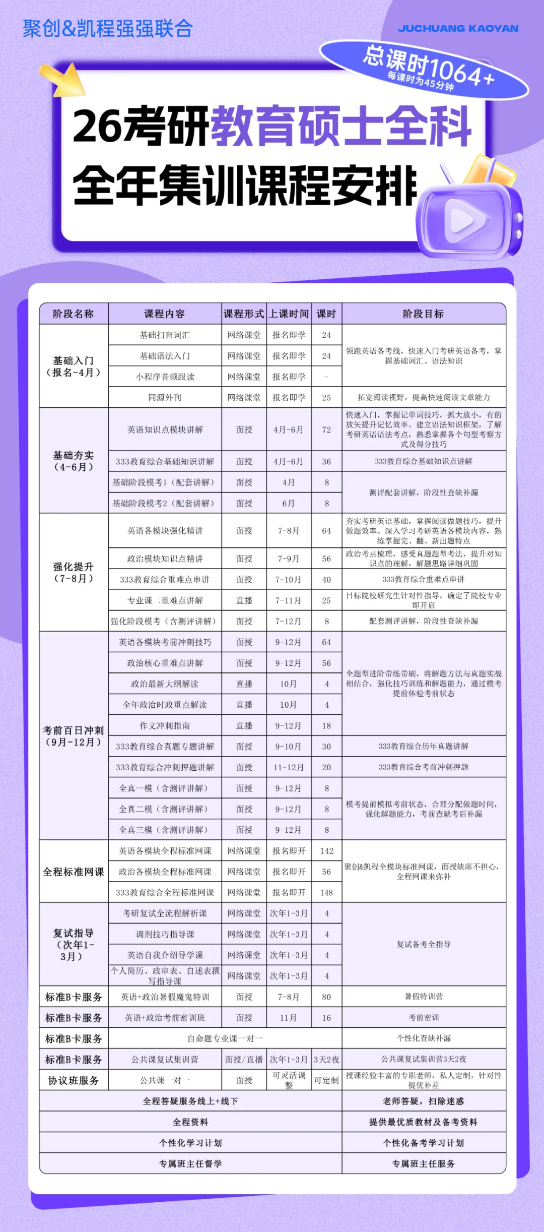 聚创考研教育硕士全科面授集训营采用圆梦卡全程全方位个性化辅导理念,结合线下+线上形式,每次课都有回放,方便复习。