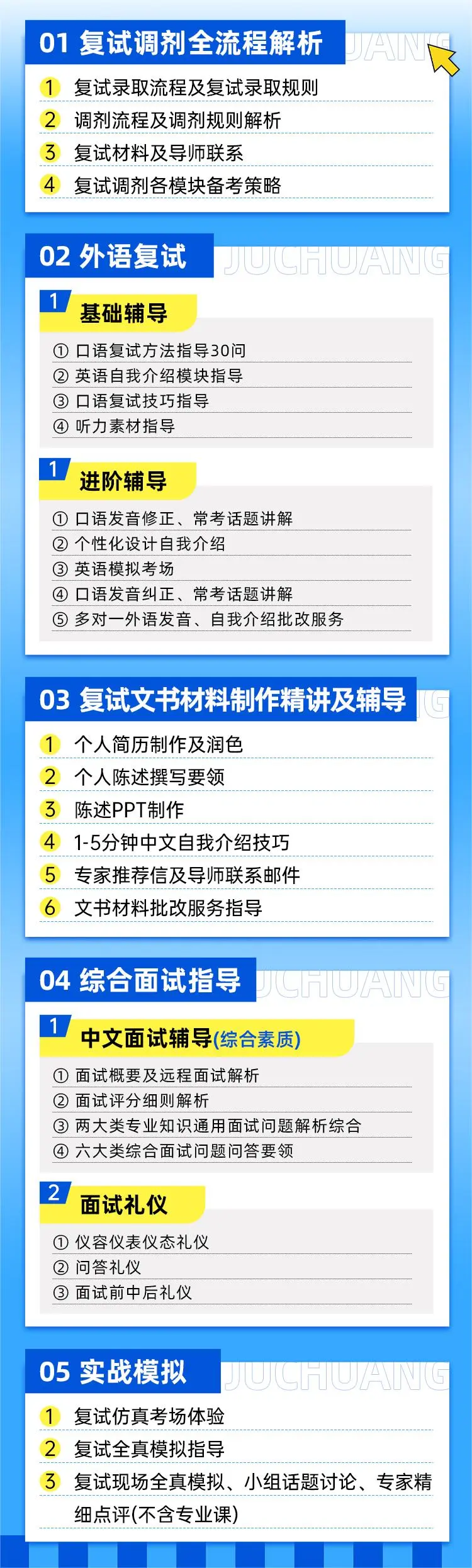 提供“初试+复试”一条龙服务,复试阶段包括综合面试指导、专业课定向小班辅导、复试调剂指导、目标院校研究生分享经验等。