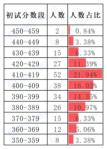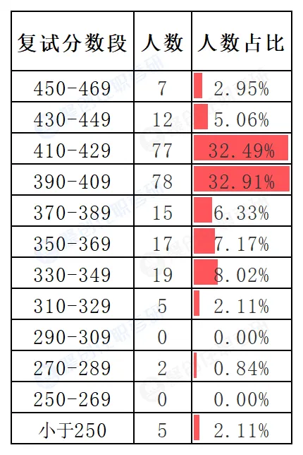 拟录取考生名单中,复试分数在390分-429分的考生占比最多,只有一位考生复试分数327分也被录取,但是这位考生初试成绩在420分以上,属于初试成绩排名靠前但是在复试有点栽跟头了,说明复试还是要好好准备,初试高分也不能对复试掉以轻心。