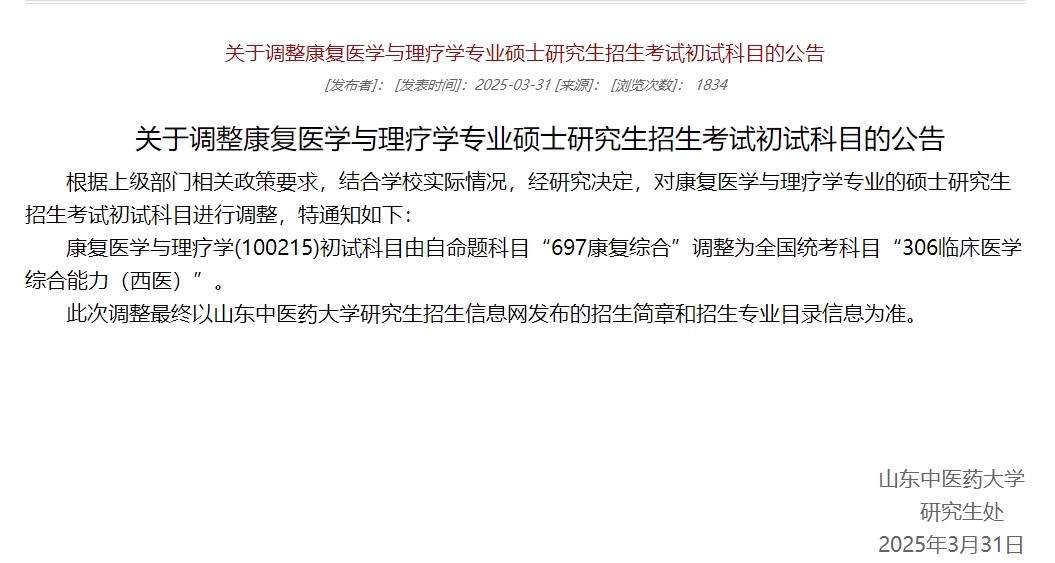 山东中医药大学3月31日发布:康复医学与理疗学(100215)初试科目由自命题科目“697康复综合”调整为全国统考科目“306临床医学综合能力(西医)”。