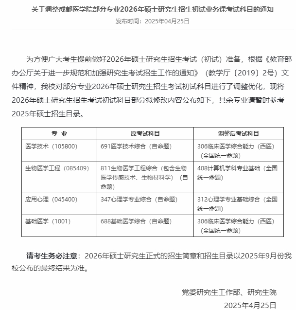成都医学院4月25日发布:“我校对部分专业2026年硕士研究生招生考试初试科目进行了调整优化。”