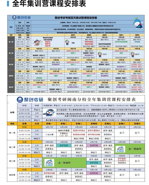 以上是聚创考研网为考生整理的"厦门考研集训营课程安排表格,厦门考研二战集训营课程安排"的相关考研信息,希望对大家考研备考有所帮助! 备考过程中如有疑问,也可以添加老师微信juchuang911进行咨询。
