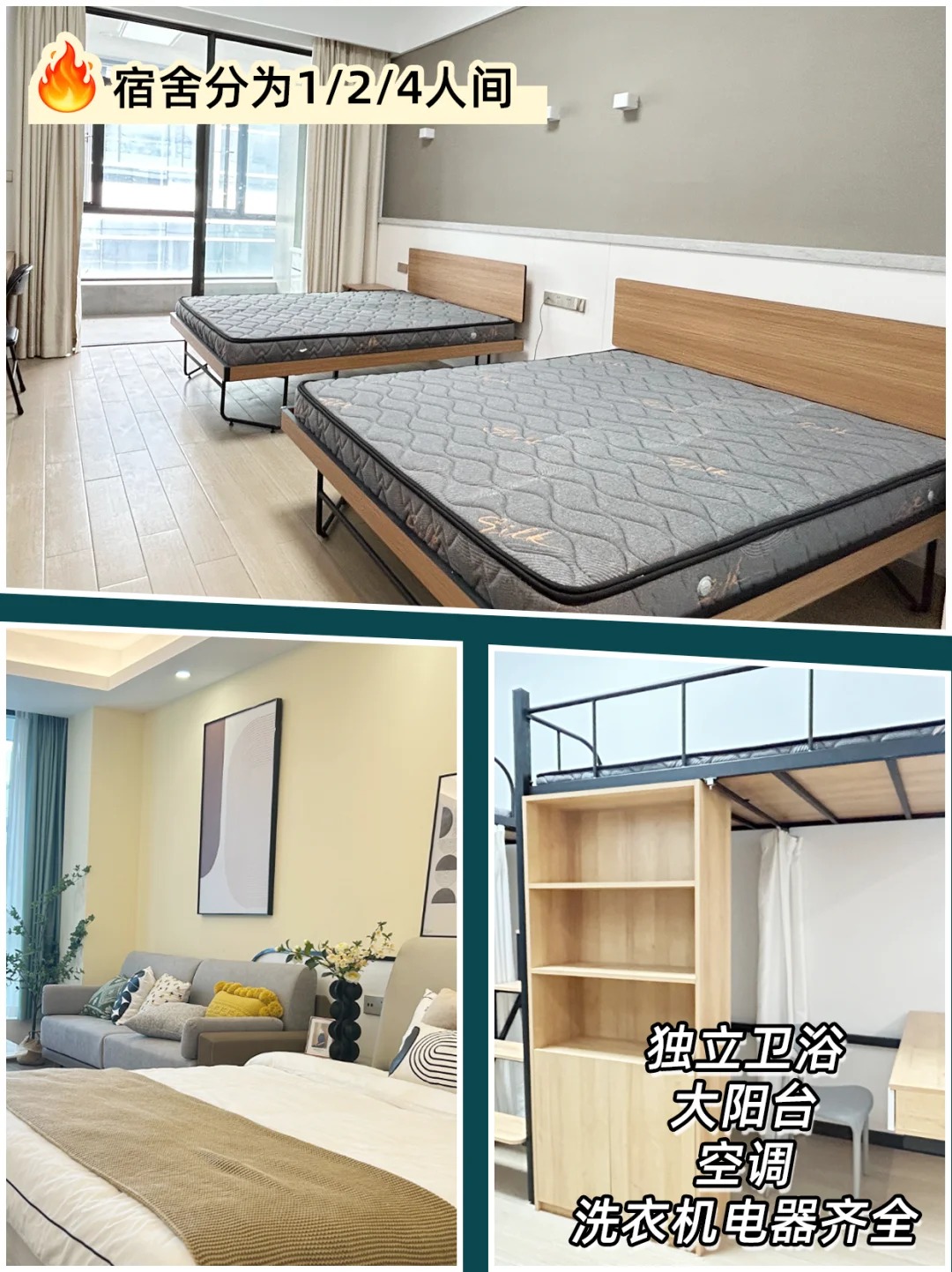 1/2/4人间灵活选择,每间标配干湿分离卫浴+超大露台,阳光通透不压抑。