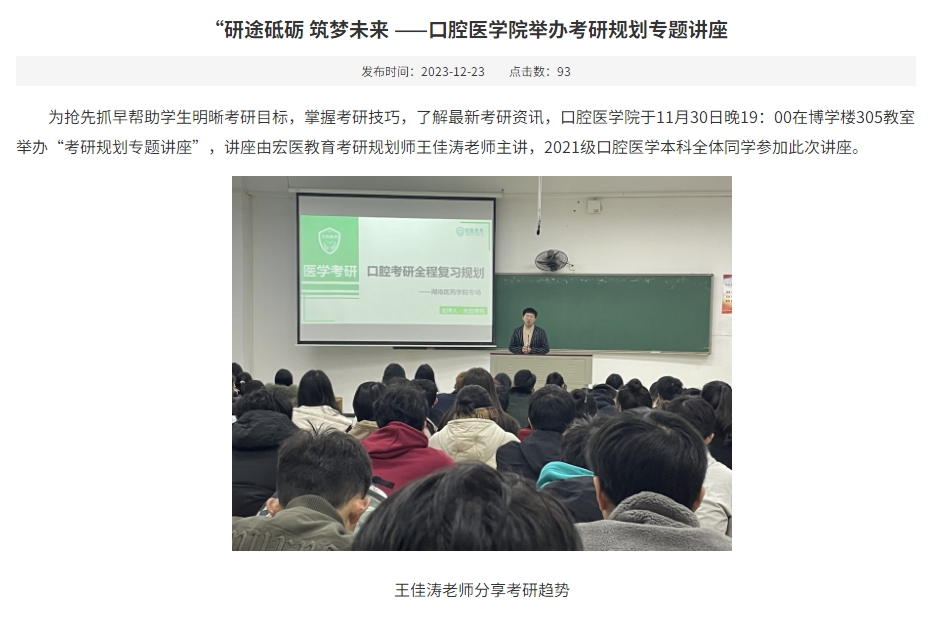 丰富讲座资源:踩准报考、冲刺、调剂等各个时间节点,每年线上线下结合开展 10 余期系列辅导讲座。讲座内容广泛,涵盖考研形势分析、专硕与学硕对比、考试科目特点、教材过渡期影响、备考技巧及时间管理策略等,为学生提供全方位、多角度的考研指导。
