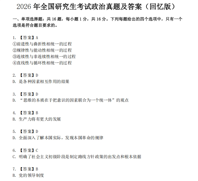 以上是聚创考研网为考生整理的"【对答案】2026年考研政治真题及答案"的相关考研信息,希望对大家考研备考有所帮助! 备考过程中如有疑问,也可以添加老师微信juchuang911进行咨询。