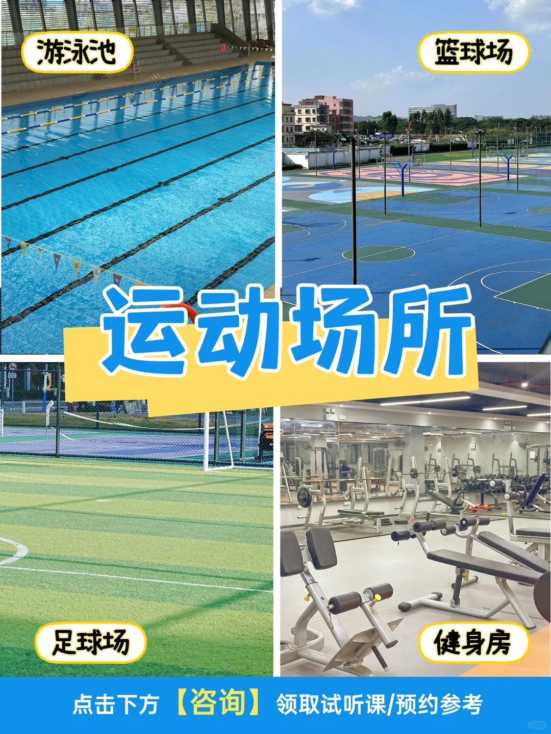 ✅运动场所多多,比如健身房、篮球场、游泳池等