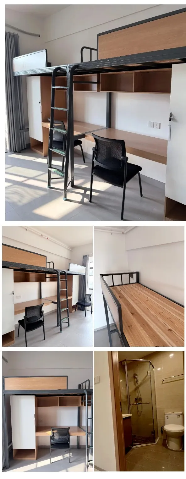 四人间上床下桌,独立空调+冰箱+洗衣机+干湿分离卫浴,阳台晾晒阳光管饱;水电按民用收,省钱贴心。