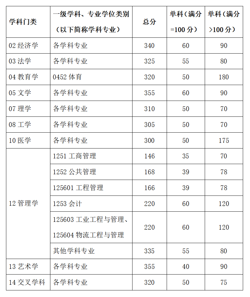 三、报考“退役大学生士兵”计划的考生,初试成绩总分、单科不低于所报考专业A类考生国家线,按照考生总分与报考学科基本要求(见上表)的差值排序(初试满分300分制的专业折算成500分制),由高到低通知复试(“差值”相同时,服役时间长的考生优先,其次按照统考英语、数学、思想政治理论成绩排序)。