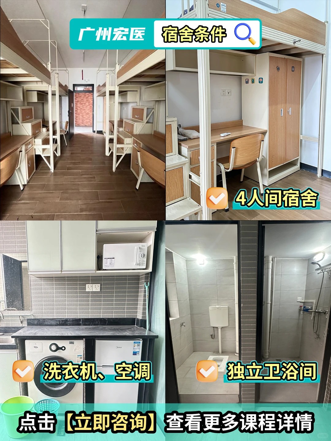 🛏 舒适住宿: 4人间随心选 |独立卫浴、全自动洗衣机、冷暖空调 | 高速WIFI全覆盖,备考休息两不误