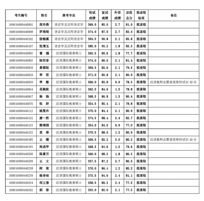 北京大学对外汉语教育学院2016年内地研究生拟录取公示名单
