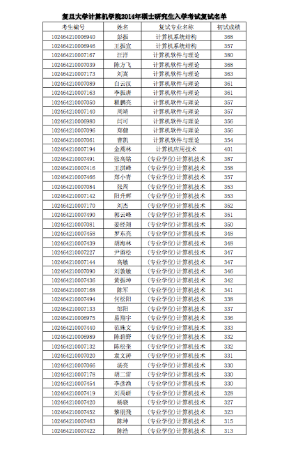 以上是聚创考研网为考生整理的"2014年复旦大学计算机学院考研复试名单"的相关考研信息,希望对大家考研备考有所帮助! 备考过程中如有疑问,也可以添加老师微信juchuang911进行咨询。