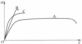 2. 现有三种材料A、B、C的拉伸曲线如图所示,分别由这三种材料制成同一构件,则:1)强度最高的是 ;2)抗拉刚度最大的是 ;3)塑性最好的是 。