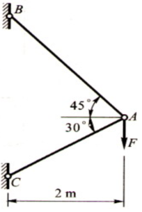 1、图示简单桁架,设AB和AC分别为直径是20mm和24mm的圆截面杆,E=200GPa,F=5kN。求A点的垂直位移。