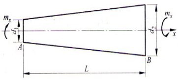 2、如图所示圆锥形扭杆,A、B两端面直径分别为,两端扭转力偶为,材料的剪切模量为G,试求杆内最大切应力与相对扭转角的表达式。