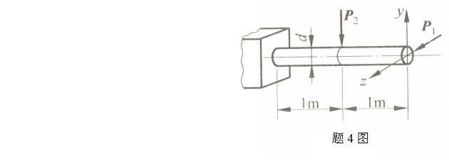 4、图示低碳钢制成的悬臂梁受水平力及铅垂力。梁横截面为圆形,,MPa。试求:1)指出危险点位置并求梁内的最大正应力;2)选用合适的强度理论对梁进行强度校核。