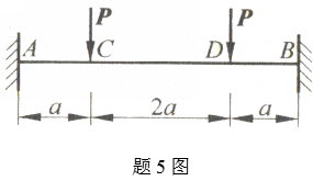 5、两端固支梁受力如图所示。其抗弯刚度为EI,试用力法(正则方程)求约束反力,并绘制出梁的弯矩图。