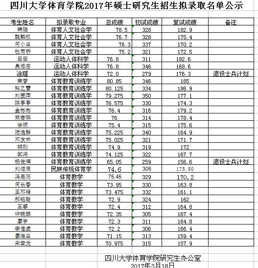 2017年四川大学体育学院硕士研究生拟录取名单公示已公布,聚英四川大学考研网为您整理如下: