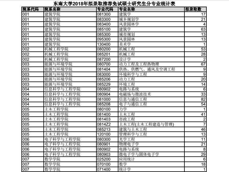 东南大学2018年拟录取推荐免试硕士研究生分专业统计表:http://www.juyingonline.com/down/details/290825