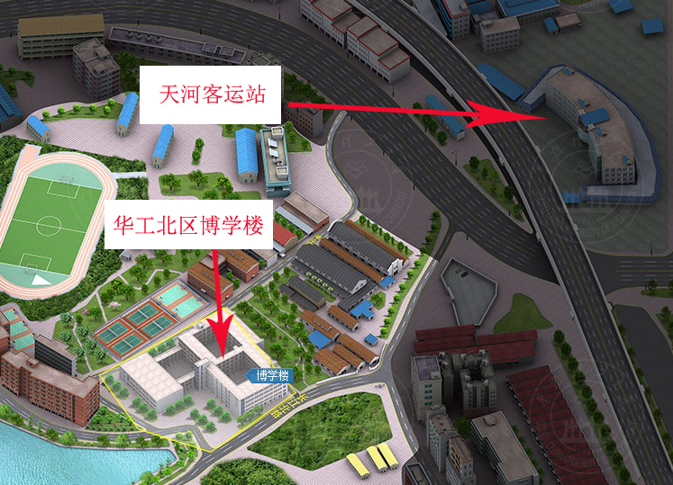 乘坐地铁或公交达到天河客运站后,可步行达到我校北区博学楼,线路:天河客运站正门——过马路(燕岭路)到达加油站——向左约30米右转进入长福路——大约150米右手边——华工五山校区北区东北门——大约30米右边即是我校五山校区北区博学楼。