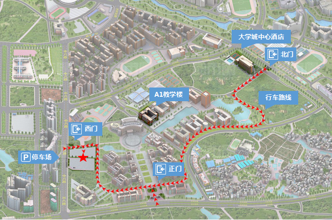 地铁:4号线“大学城南站”D出口,沿中环东路东北方向前行约500米右转到达华工大学城体育馆,穿过体育馆即到达A1栋教学楼。