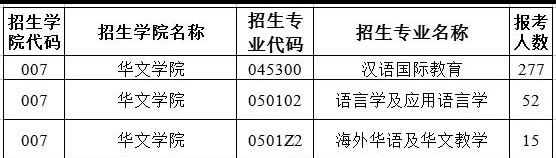 据悉,暨南大学华文学院2018年考研报考人数已公布,聚英考研网小编为大家整理了各院系的相关信息,具体内容请看下表: