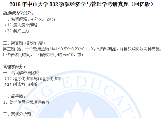 聚英中大考研网整理了2018年中山大学832微观经济学与管理学考研真题(回忆版),部分内容如下: