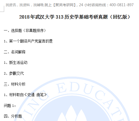 以上是聚创考研网为考生整理的"2018年武汉大学313历史学基础考研真题(回忆版)"的相关考研信息,希望对大家考研备考有所帮助! 备考过程中如有疑问,也可以添加老师微信juchuang911进行咨询。