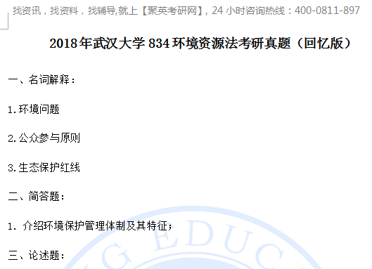 聚英武大考研网整理了2018年武汉大学834环境资源法考研真题(回忆版),部分内容如下: