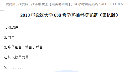 以上是聚创考研网为考生整理的"2018年武汉大学638哲学基础考研真题(回忆版)"的相关考研信息,希望对大家考研备考有所帮助! 备考过程中如有疑问,也可以添加老师微信juchuang911进行咨询。