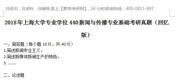 聚英上大考研网整理了2018年上海大学专业学位440新闻与传播专业基础考研真题(回忆版),部分内容如下: