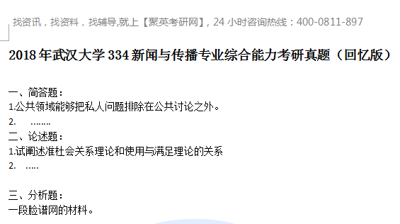 聚英武大考研网整理了2018年武汉大学334新闻与传播专业综合能力考研真题(回忆版),部分内容如下: