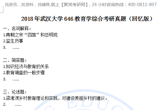 聚英武大考研网整理了2018年武汉大学646教育学综合考研真题(回忆版),部分内容如下: