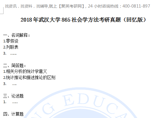 以上是聚创考研网为考生整理的"2018年武汉大学865社会学方法考研真题(回忆版)"的相关考研信息,希望对大家考研备考有所帮助! 备考过程中如有疑问,也可以添加老师微信juchuang911进行咨询。