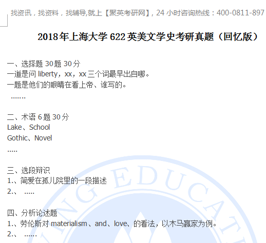 聚英上大考研网整理了2018年上海大学622英美文学史考研真题(回忆版),部分内容如下: