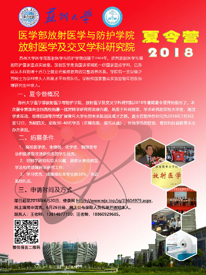 苏州大学医学部放射医学与防护学院,放射医学及交叉学科研究院2018年暑期夏令营开始报名了。本次夏令营面向全国高校招募一批对科学研究有浓厚兴趣、热衷于科研探索、学术研究的在校大学生,通过学术互动、思维启迪等方式扩展青年大学生的未来规划及成才之路。夏令营的举办时间为2018年7月9日至12日,为期四天,招收30-40名学员(名额有限,报名从速)。外地学员的住宿、餐饮和往返路费由主办方承担。